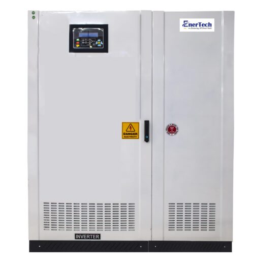 Solar Hybrid Inverter 3Ph from EnerTech, one of the prominent solar inverter manufacturers in India and power inverter manufacturer, has range of 5KVA-600KVA, Display of 32-bit DSP based design, Multi modes working SBG/SGB/Export/Batteryless, Power Factor-IGBT rectifier with PF>0.9, Customized MPPT design, Interactive front LCD to do all settings via display, MODBUS control for handshaking, Paralleling option, Remote monitoring using GSM/RS-485.