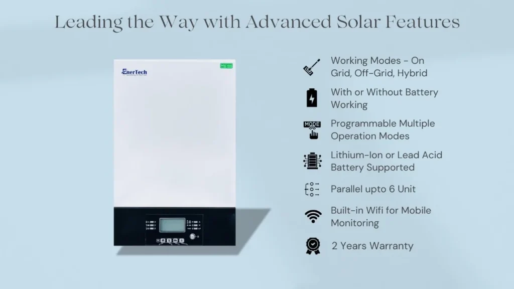 Ready to cut your electricity bills and enjoy uninterrupted power? Meet EnerTech Wall-mounted HF Solar Hybrid Inverter, a revolutionary solar inverter designed for industrial, residential, and commercial use. It’s packed with advanced features to ensure you get reliable power while saving money and going green.